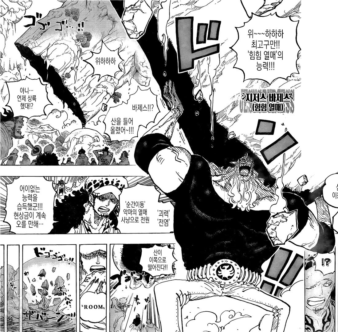 순식간에 섬으로 이동한 바제스(힘힘 열매)는 산을 들어올려 로우 일행에게 던져버리지만
