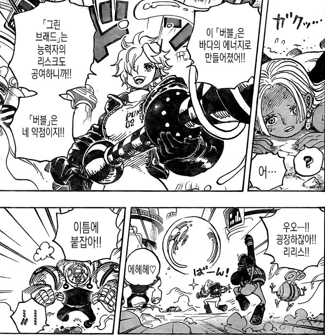 루피와 루치가 쿠마 세라핌에게 큰 기술을 날린다.