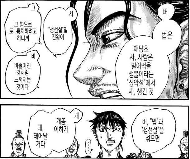 "법"과 "성선설"을 섞으면 개똥 이하가 태어날 거라 말하며